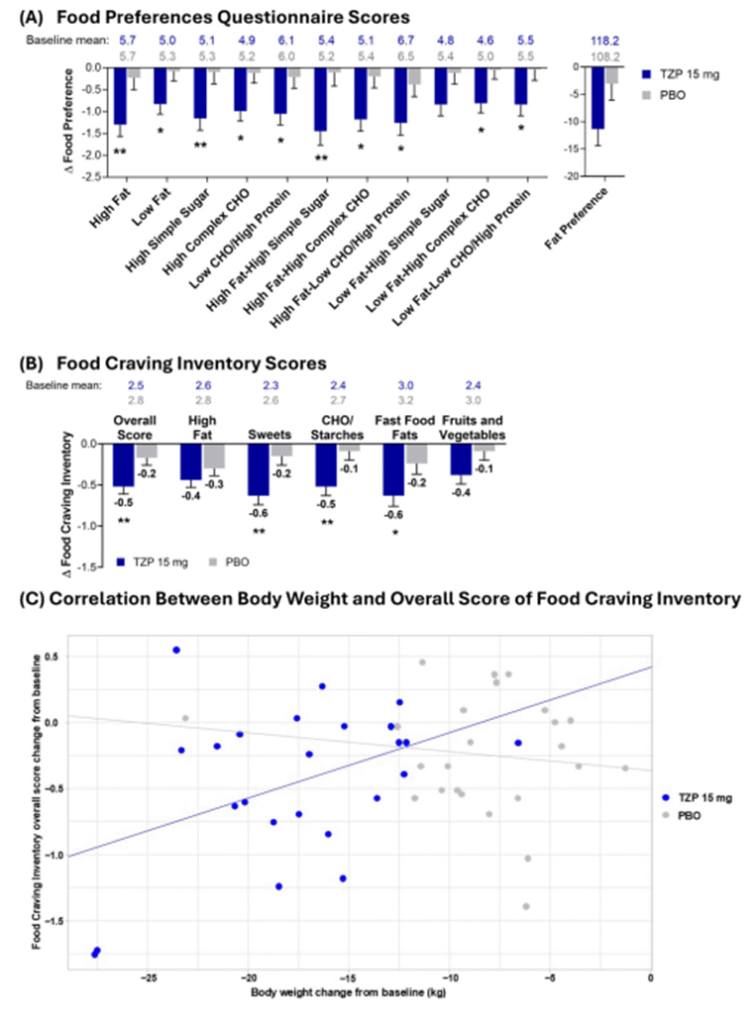 - Greater reductions in food cravings correlated with larger weight loss among tirzepatide-treated participants. (Fig. 1C)